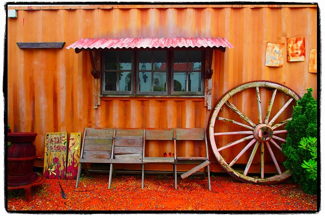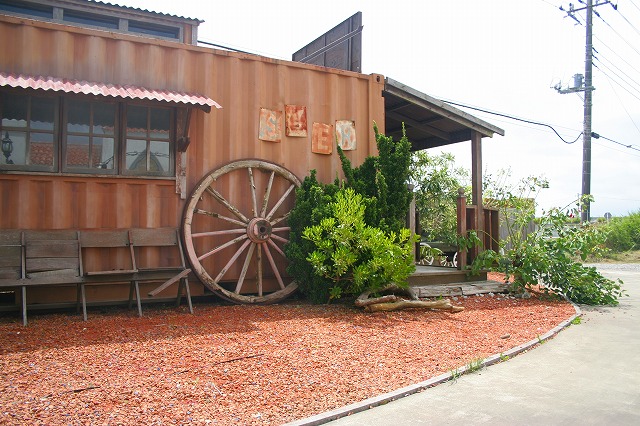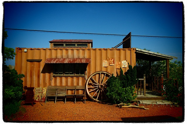コンテナを改造したバーです。板塀と赤砂利がさらに雰囲気を出しています。
