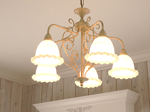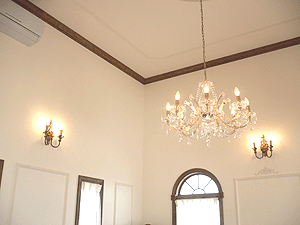 茶色を基調にした落ち着いた部屋です。スペイン製のシャンデリアが輝いています。