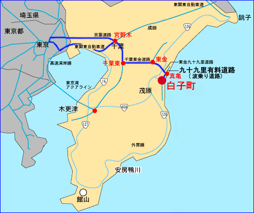 京葉道路(東関東自動車道からは、宮野木I.Cで京葉道路に乗り換え)・千葉東I.C→千葉東金有料道路・東金I.C→3kmほど国道126号→東金九十九里道路→波乗り道路・白子I.Cを下りる。
