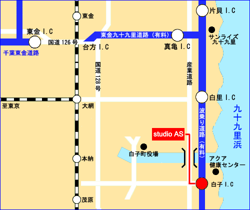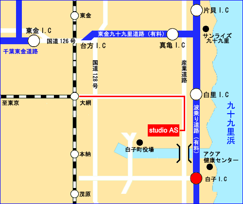 白子I.Cを下り、信号を右折、橋を渡りきった左にスタジオアズがあります。
