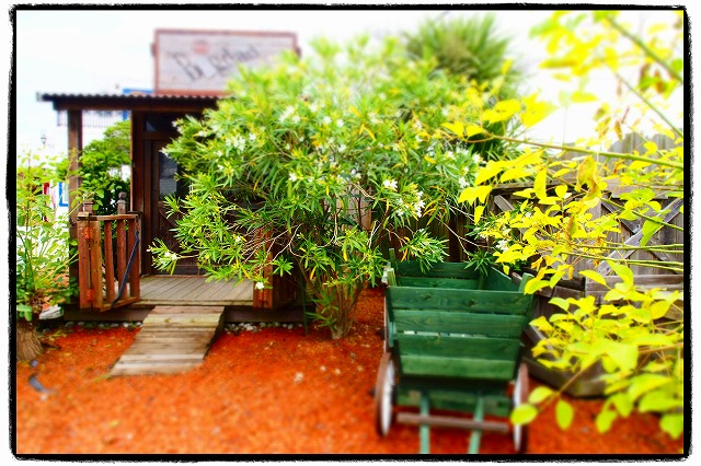 コンテナを改造したバーです。板塀と赤砂利がさらに雰囲気を出しています。