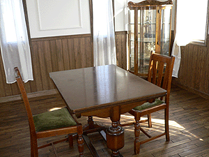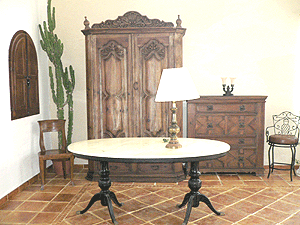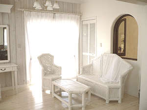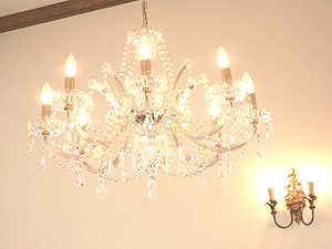 茶色を基調にした落ち着いた部屋です。スペイン製のシャンデリアが輝いています。